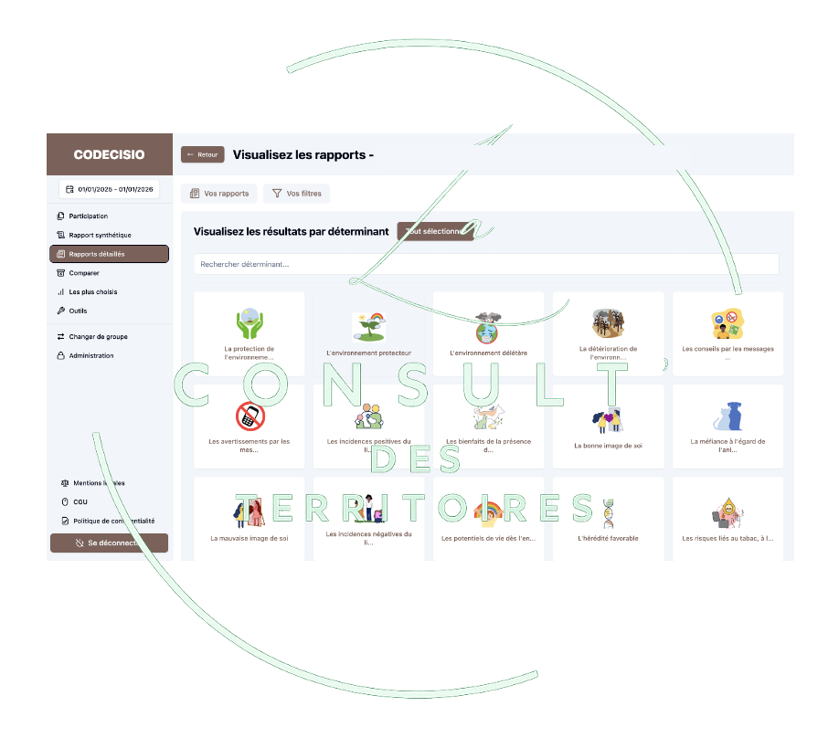 CODECISIO® permet de visualiser les perceptions des collégiens via 36 dimensions en lien avec les déterminants de la santé. Des comparaisons sont possibles entre les genres et les niveaux de classes. Un suivi de cohorte est également possible pour les établissements qui réalisent la passation sur plusieurs années.