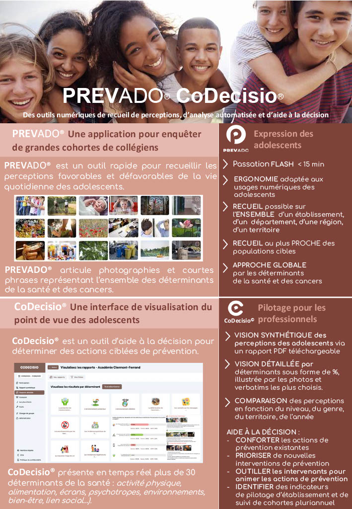 Il s’agit d’une enquête réalisée à l’aide de l’application numérique PREVADO©. Cet outil permet de recueillir les données de grandes cohortes de collégiens concernant leurs perceptions de la vie quotidienne à l’adolescence, en lien avec les déterminants de santé. L’application est associée à une plateforme automatisée d’aide à la décision, CODECISIO©, qui facilite l’analyse et l’interprétation des résultats.